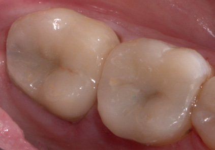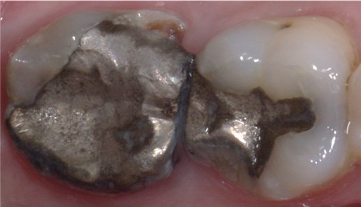 בן 60 הגיע לטיפול עם שתי סתימות עמוקות בשיניים הטוחנות, עששת בשן טוחנת האחרונה ושבר בשן שלפניה. לאחר הסרת השחזורים הישנים ונגע העששת, נמצא שאין אפשרות לבנות את השן באמצעות סתימת אמלגם (החומר שמופיע בתמונה העליונה). חוסר נרחב בחומר השן לא אפשר שימוש בסתימות לבנות. הוחלט אפוא לבצע ONLAY מחומר מיוחד (EMAX) ובאופן זה לשפר את תפקוד השן ואת מראהּ.