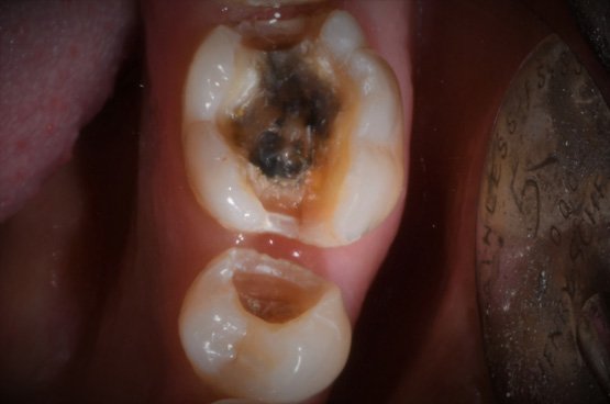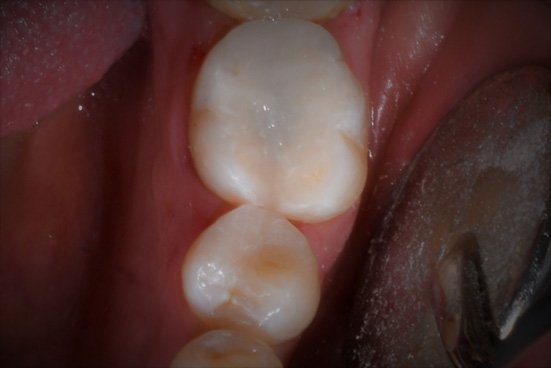 מטופל בן 40 הגיע לטיפול עם עששת נרחבת. לאחר סילוק העששת הונחו שני שחזורי קומפוזיט (סתימה לבנה).